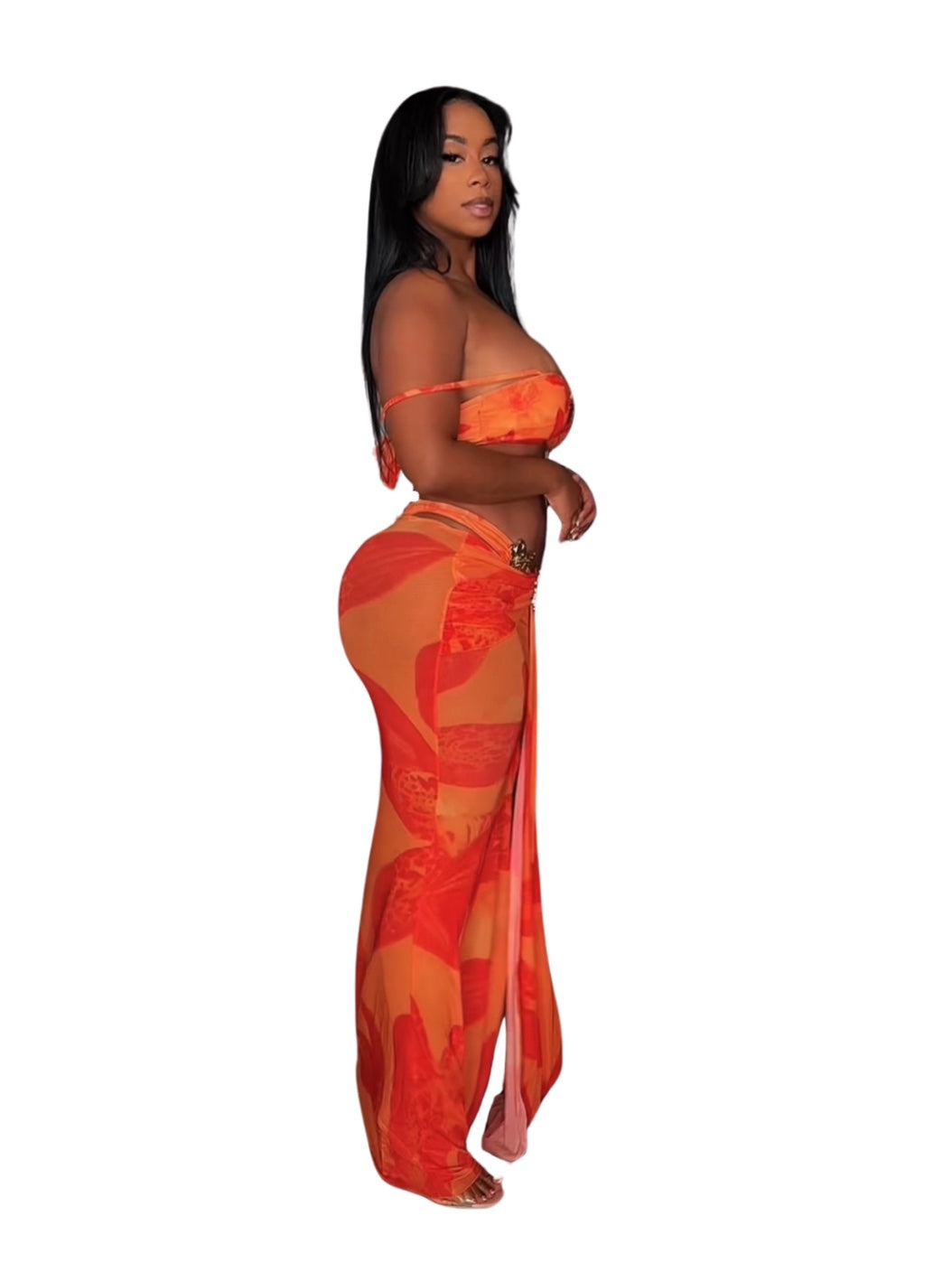 Get ready to turn heads in our Tropiluxe Set! This 3 piece bikini set features a stunning floral print with elegant gold accents. The bra provides support and comfort while the cheeky bottoms offer a flattering fit. Complete your beach look with the mesh skirt, featuring two high slits for added glamour.